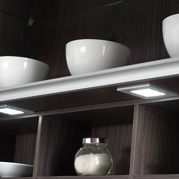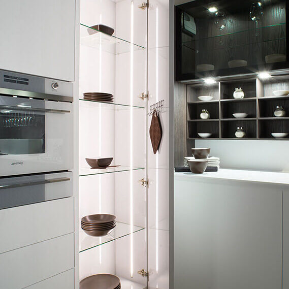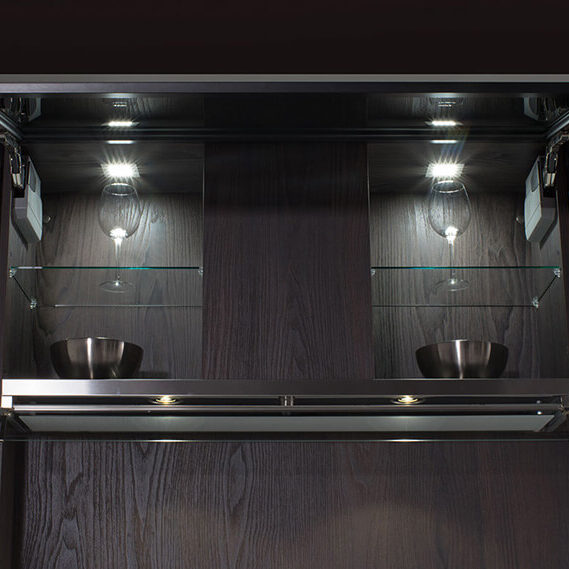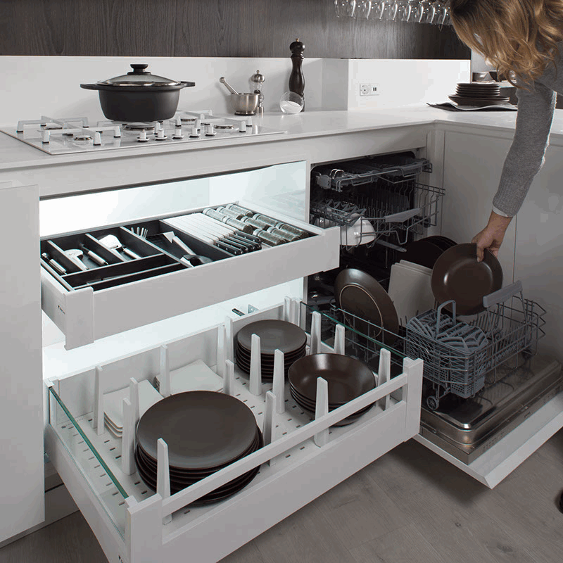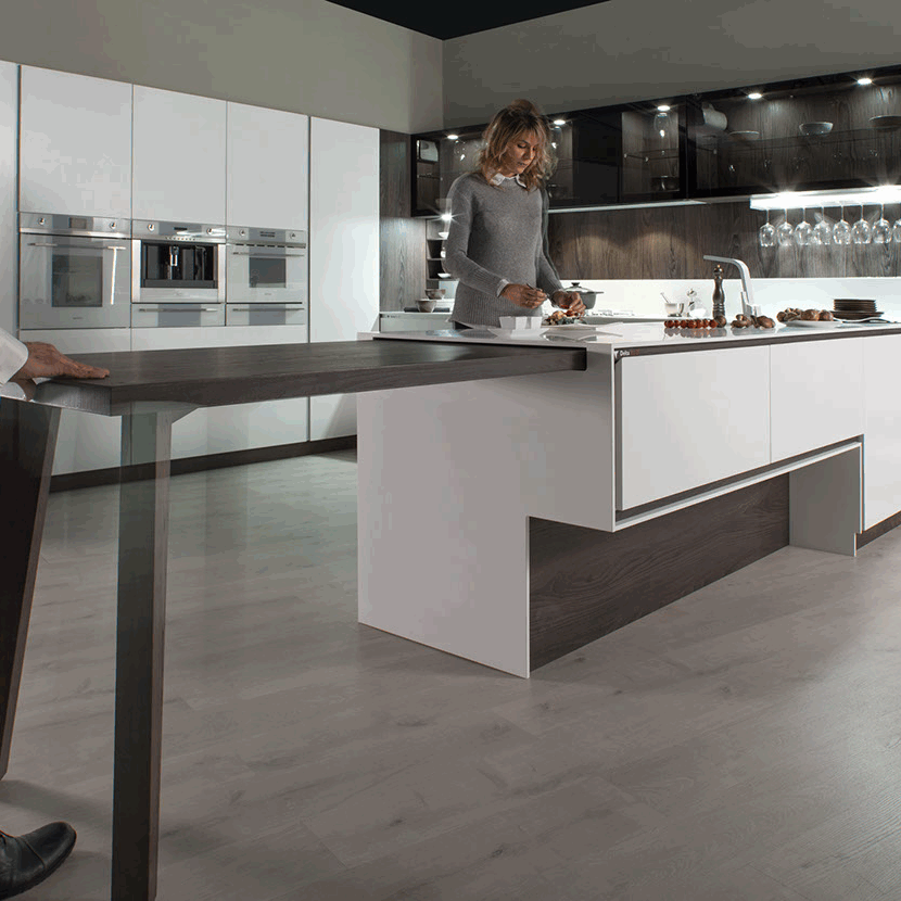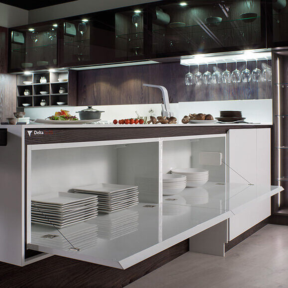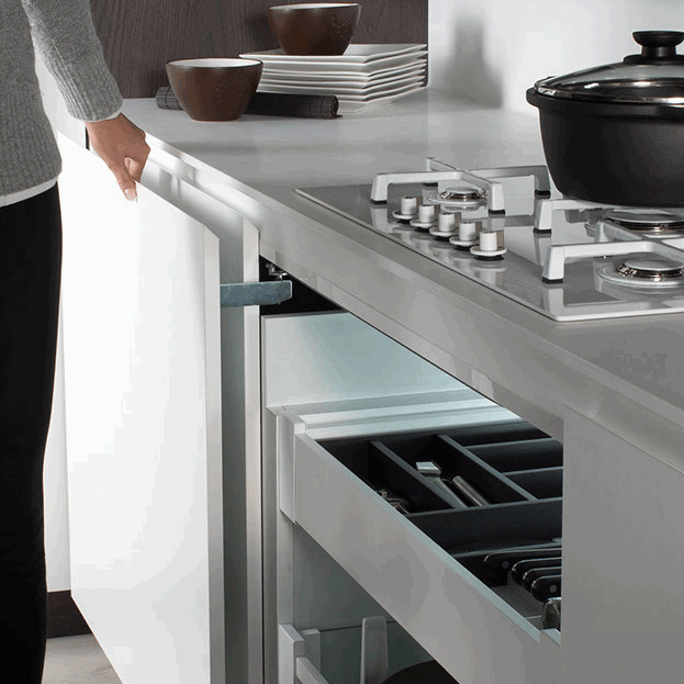 Los muebles de cocina con tirador de 45 grados son la línea más refinada de Delta Cocinas. Su canto biselado a 45º en aluminio ofrece una opción real a los tradicionales tiradores y una funcionalidad extrema.